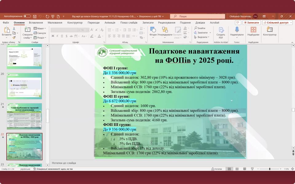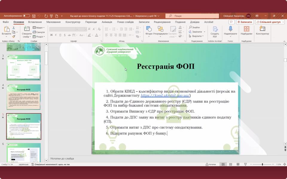 В рамках тижня обліково-економічних дисциплін у нас відбулась гостьова лекція д.е.н., професора кафедри обліку і оподаткування Факультет економіки і менеджменту Сумського НАУ Олександра НАЗАРЕНКА на тему «Від мрії до власного бізнесу: податки, які потрібно знати».