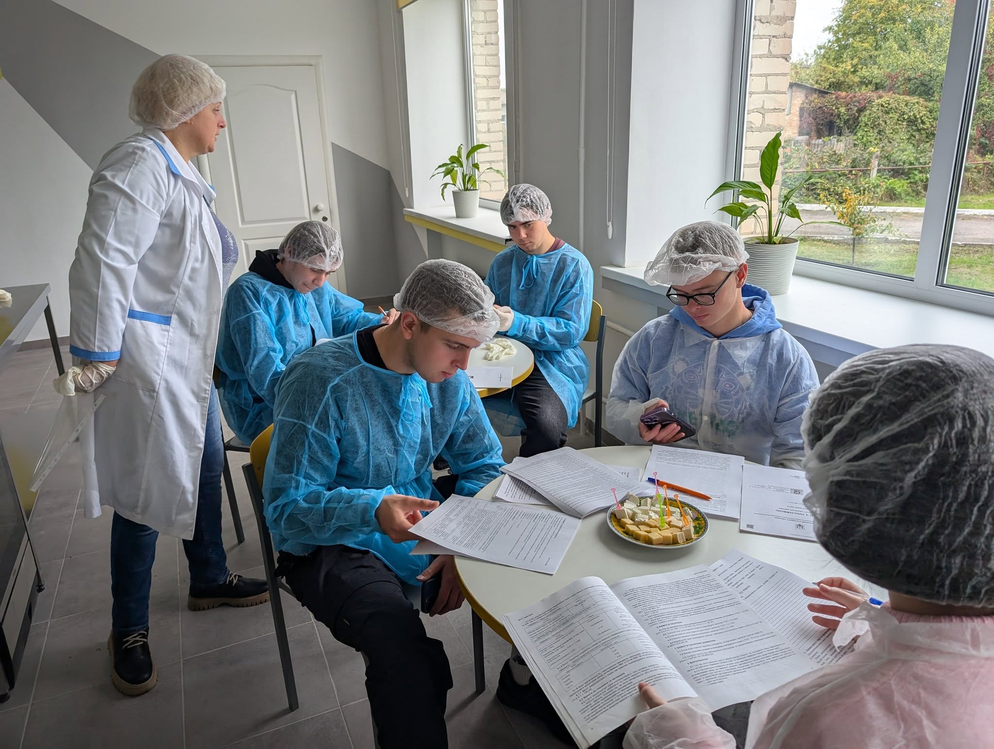 На лабораторному занятті студенти також провели органолептичну оцінку сирів за запропонованими варіантами (твердий сир «Голландський», плавлений сир «Вершковий» і м’який сир «Бринза»), використовуючи свої органи чуття — зір, нюх, дотик та смак. Це дозволило їм оцінити якість сиру за кількома критеріями та порівняти його характеристики з галузевими стандартами.