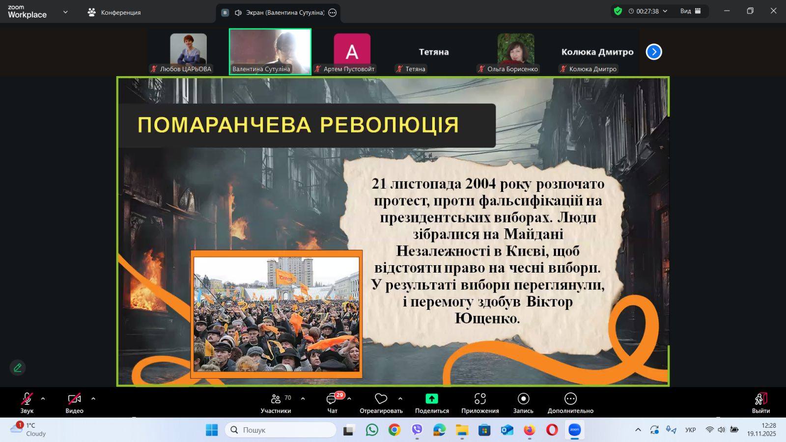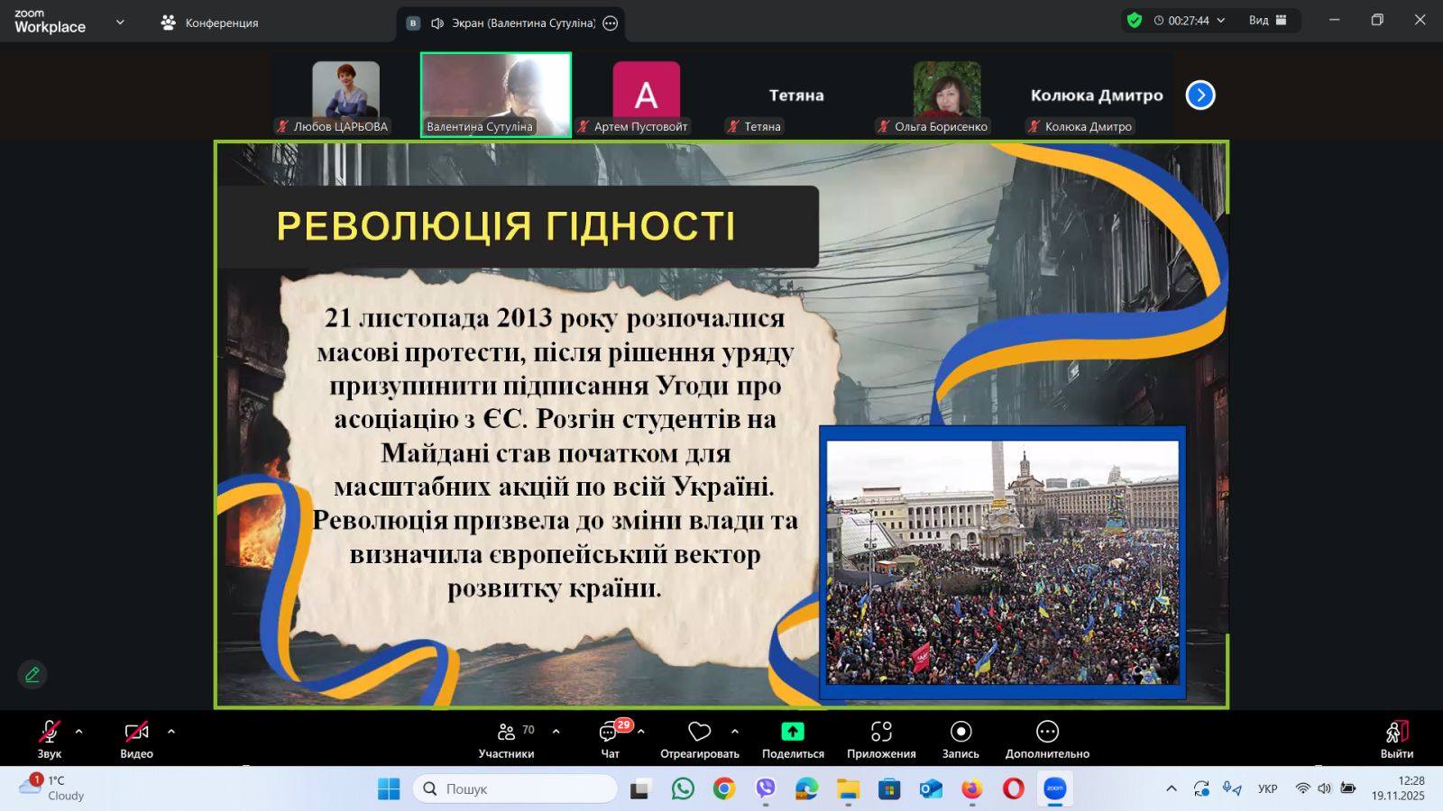 Сьогодні 28, 28П, 22 навчальні групи, разом з куратором Сутуліною В.Ю. провела надзвичайно важливу та зворушливу відкриту виховну годину, присвячену Дню Гідності та Свободи. Це не просто дата в календарі, це серце нашої нації, нагадування про ціну, яку ми платимо за право бути вільними. Ми почали з обговорення фундаментальних понять — свободи та гідності. Ці слова набули особливого, кривавого значення для України, ставши справжнім кодом нашої ідентичності. Провели глибокий екскурс у події, які передували встановленню цієї дати. Згадали Помаранчеву революцію та Революцію Гідності, нагадавши собі та присутнім про символи цих доленосних подій.