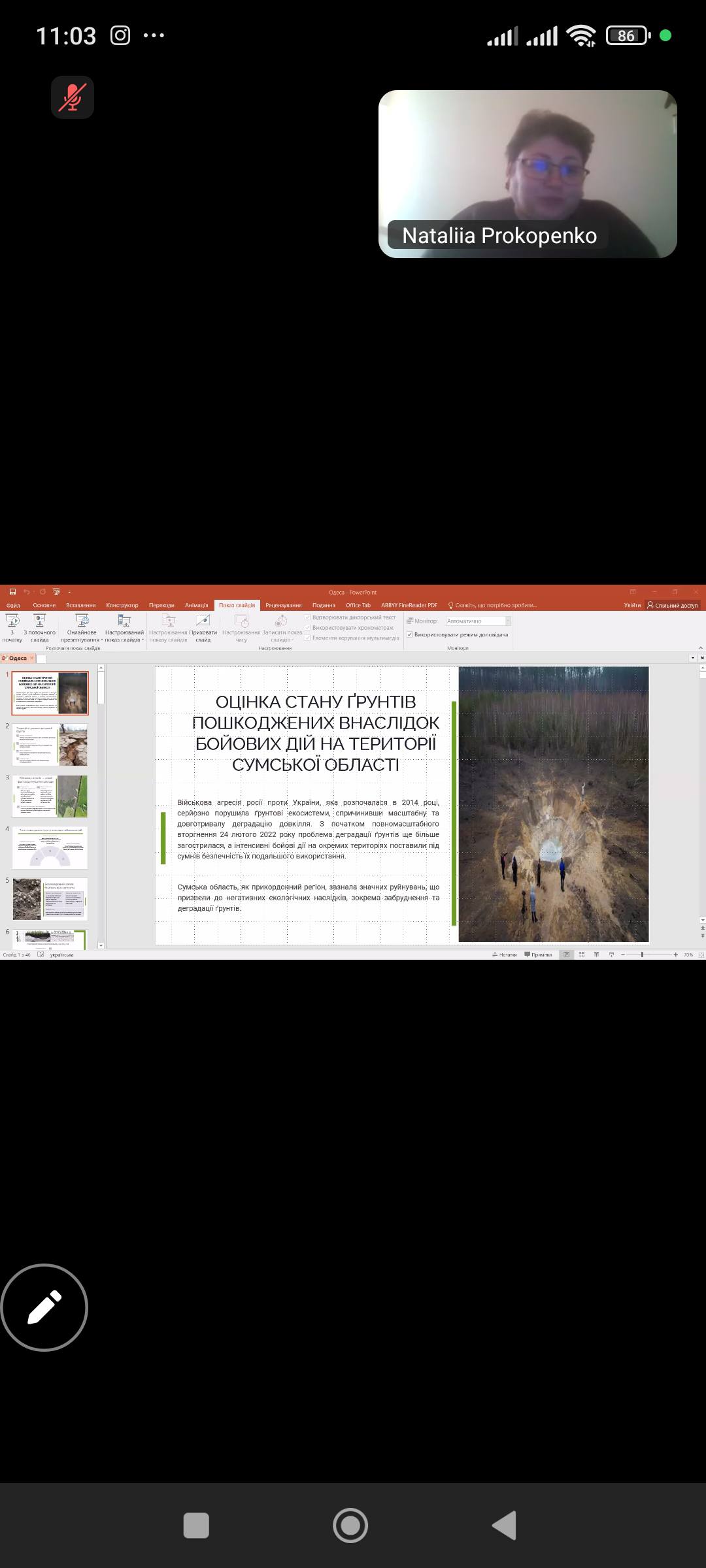 Сьогодні відбулася пізнавальна лекція для здобувачів освіти зі спеціальності "Право" на тему: «Оцінка стану ґрунтів, пошкоджених внаслідок бойових дій на території Сумської області», яку провела к.е.н., доцент кафедри геодезії та землеустрою СНАУ Наталія ПРОКОПЕНКО.